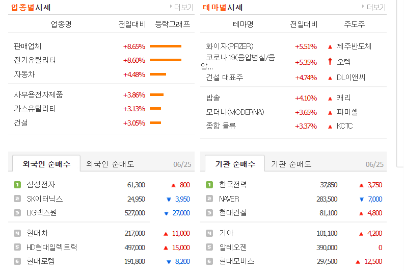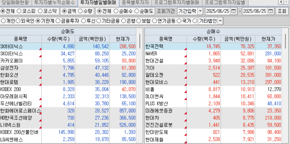 기관 순매수는 전력, 인터넷, 자동차, 증권, 제약바이오, 반도체 등을 순매수.