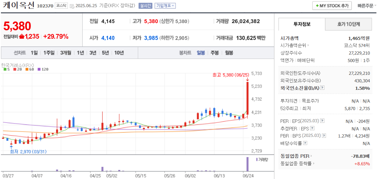 | 5 | 케이옥션 | +29.79% | 1,306 | 토큰증권 플랫폼 구축 수혜, STO 테마 상승 | +2,888 | -1,801 | -61 |