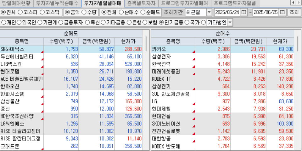 연기금 순매수는 반도체, 인터넷, 증권, 항공, 건설, 지주사 등을 순매수
