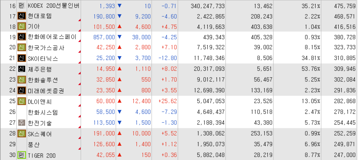 | 종목명 | 등락률 | 거래대금(억) | 이슈 내용 | 개인 | 외국인 | 기관 | |
