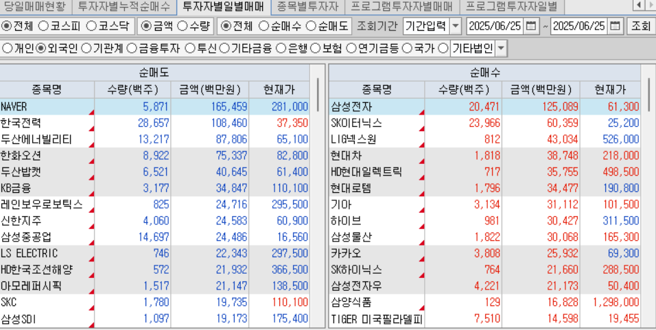 오늘 외국인 순매수는 반도체, 방산, 전력, 자동차, 대체에너지 관련주 순매수.
