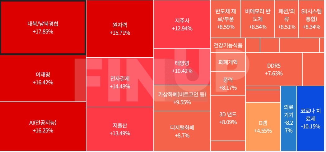 오늘은 남북화해 이슈가 나오면서 남북경협주가 크게 상승을 보였고, 기존 정책관련주인