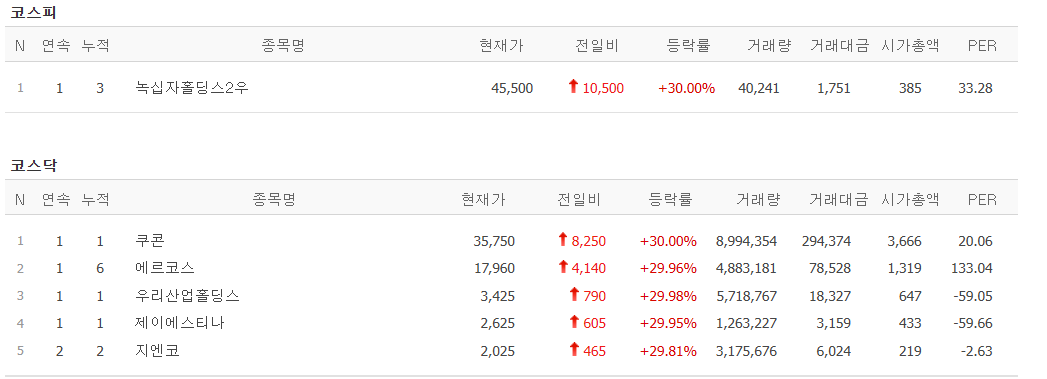 오늘의 상한가 종목