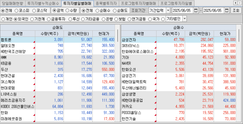 오늘 외국인 순매수는 반도체, 방산, 자동차, 전력, 원전, 보험, 조선, 인터넷 등을 순매수.