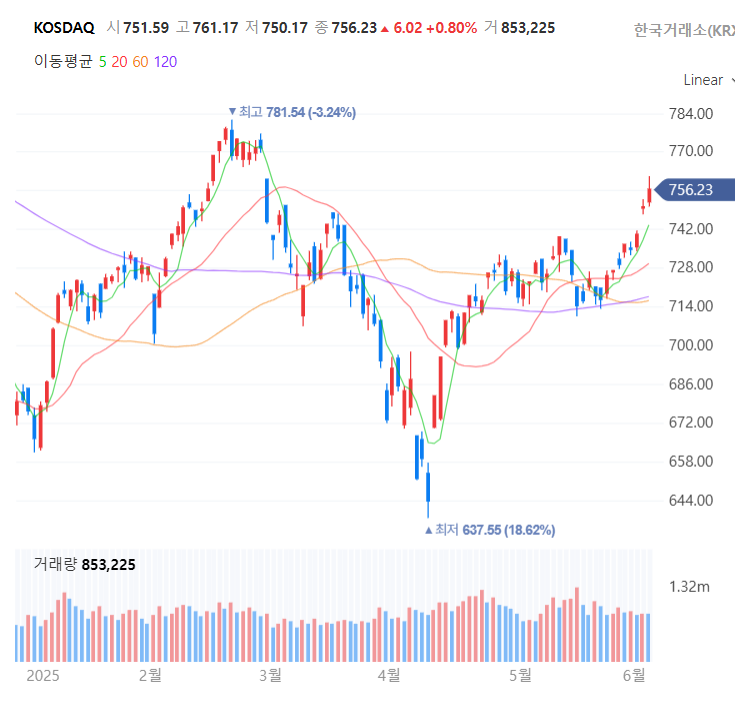 오늘 주식 시장도 이재명 대통령 취임 2일째 외국인 순매수가 들어오면서 양시장 모두 상승함.