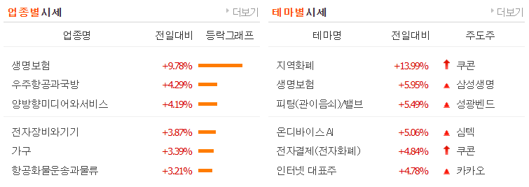 시가총액 상위 종목에서는 반도체, 방산, 자동차, 원전, 보험, 인터넷, 전력등이 상승을 보였고