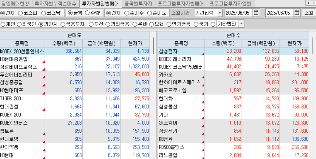 오늘 기관 순매수는 반도체, 인터넷, 방산, 2차 전지, 자동차, 반도체 장비, 등을 순매수.