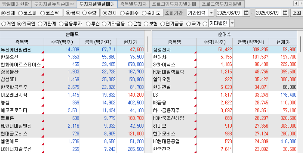 오늘 외국인 순매수는 반도체, 전력, 금융, 엔터, 조선, 바이오, 자동차 등을 순매수.
