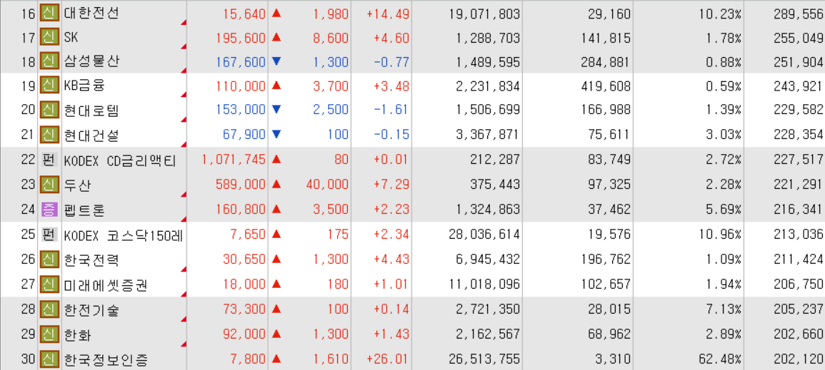 오늘 거래대금 상위 종목에서는 정부정책 관련해서 지역화폐 관련주, AI 관련주, 지주사, 전력, 자동차 등이