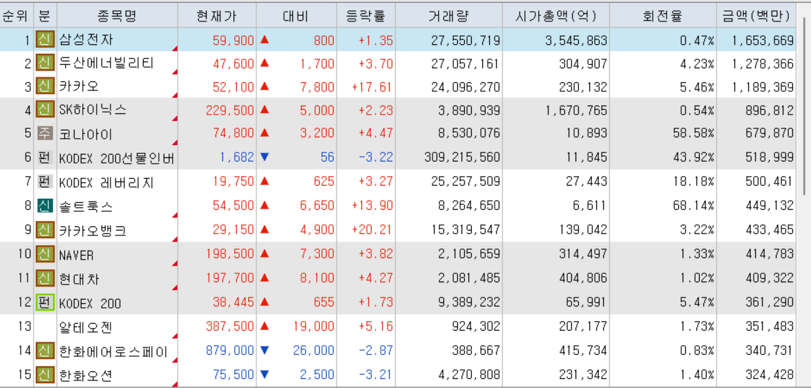 거래대금은 13조 6139억 원으로 전 거래일보다 4천억 원가량 늘어남.