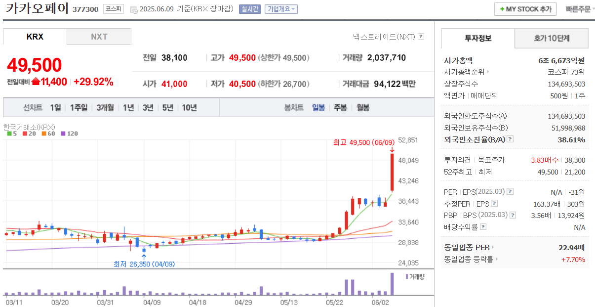 카카오 그룹주가 AI정책수혜주로 거론되면서 크게 상승 마감.