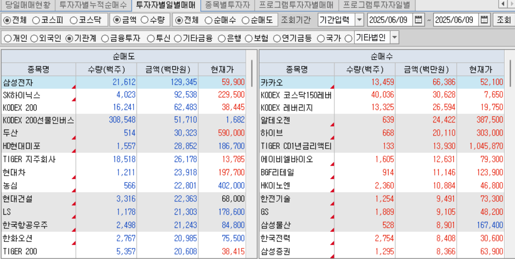 오늘 기관 순매수는 카카오, 제약바이오, 전력, 증권, 엔터 등을 순매수.