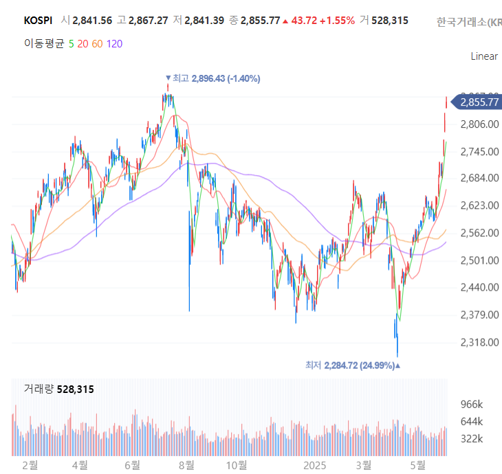 코스피 지수는 1.55% 상승한 2855.77로 마감. 전고점인 2896.43을 앞두고 있음.