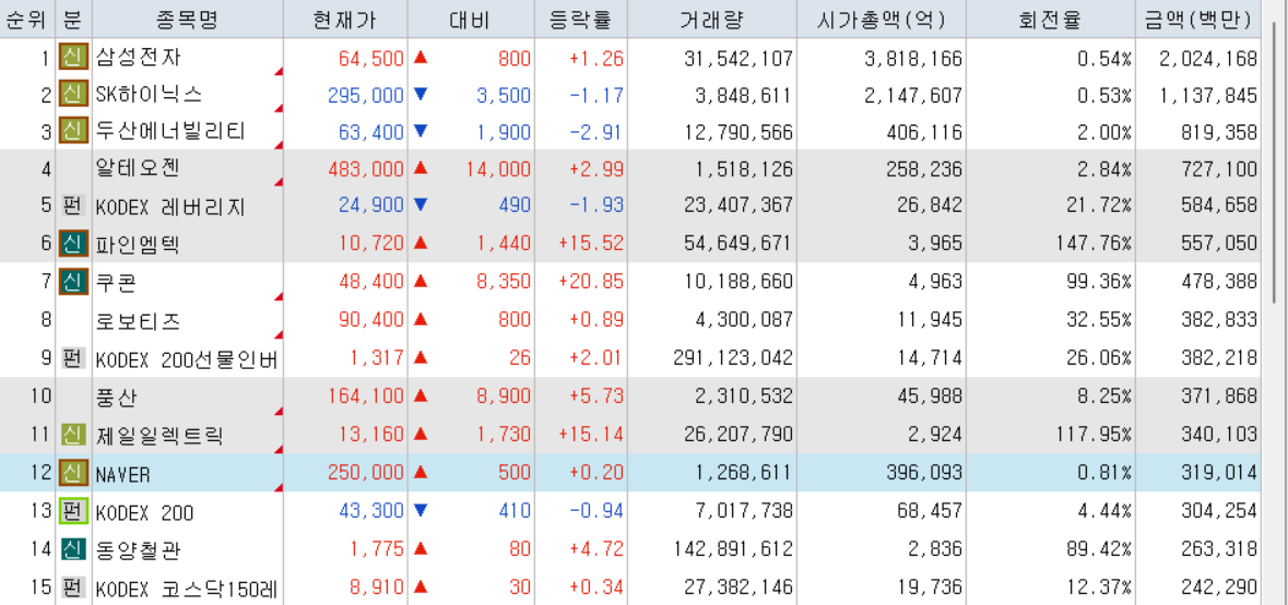 오늘 거래대금 상위 종목에서는 알테오젠이 신고가를 경신하면서 상승, 파인엠텍이 애플 폴더블폰 이슈로 상승.