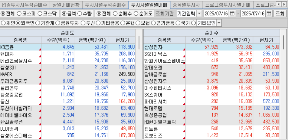 오늘 외국인 순매수 종목은 반도체, 방산, 제약바이오, 화장품, 로봇, 전력 등을 순매수