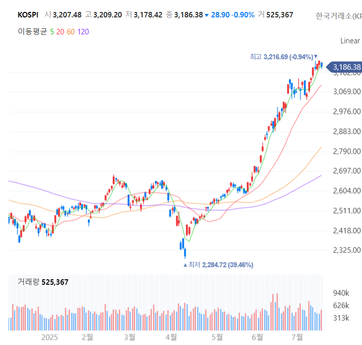 오늘 코스피 지수는 차익매물에 하락 마감. 코스피 지수는 0.9% 하락한 3186.38로 마감.