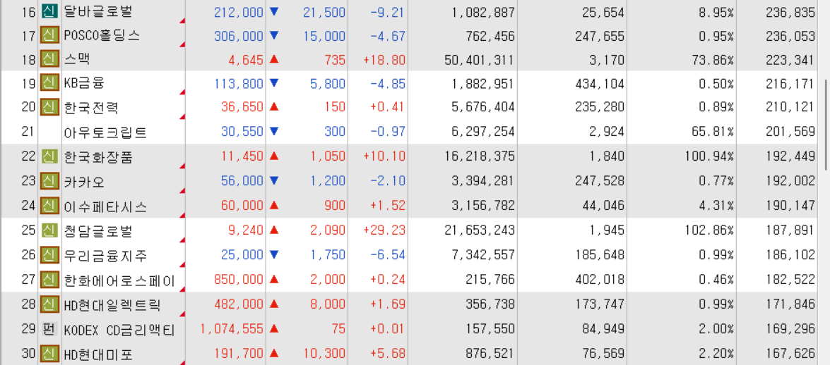 외국인과 기관이 각각 743억 , 648억 순매도. 거래대금은 7조 31억 으로 전날보다 4천억 원가량 줄어듦.