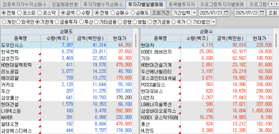 오늘 외국인 순매수 종목은 자동차, 전력, 식품, 제약바이오, 방산 등을 순매수