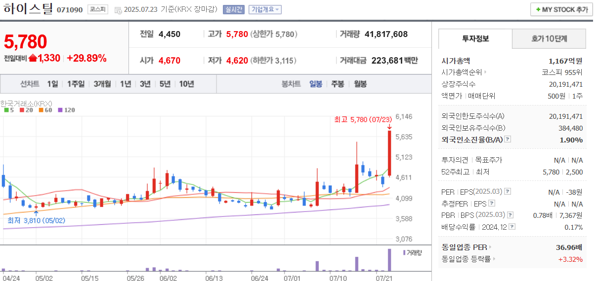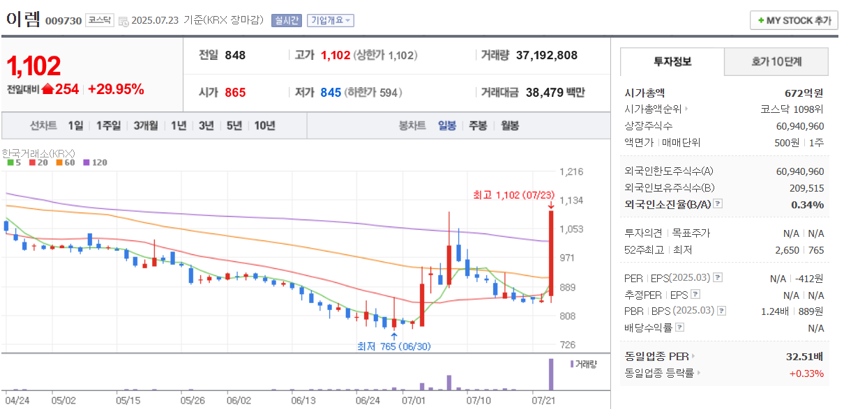 상한가 마감한것으로 보임. 일단 신고가라 수급을 보면서 지켜봐야겠음.