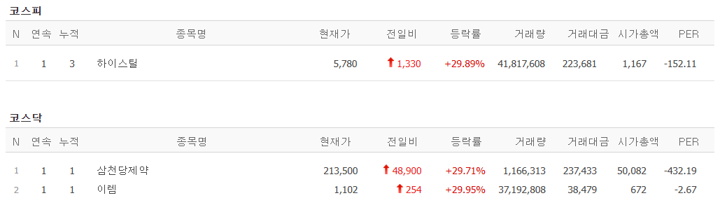 오늘의 상한가 종목