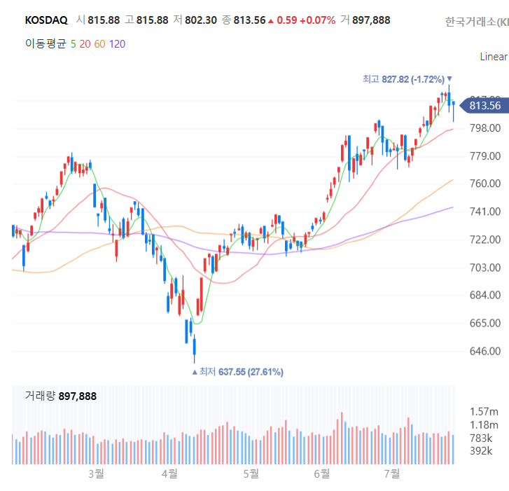 코스닥 지수는 0.07% 상승한 813.56으로 마감. 외국인과 기관이 각각 327억, 1072억 순매수.