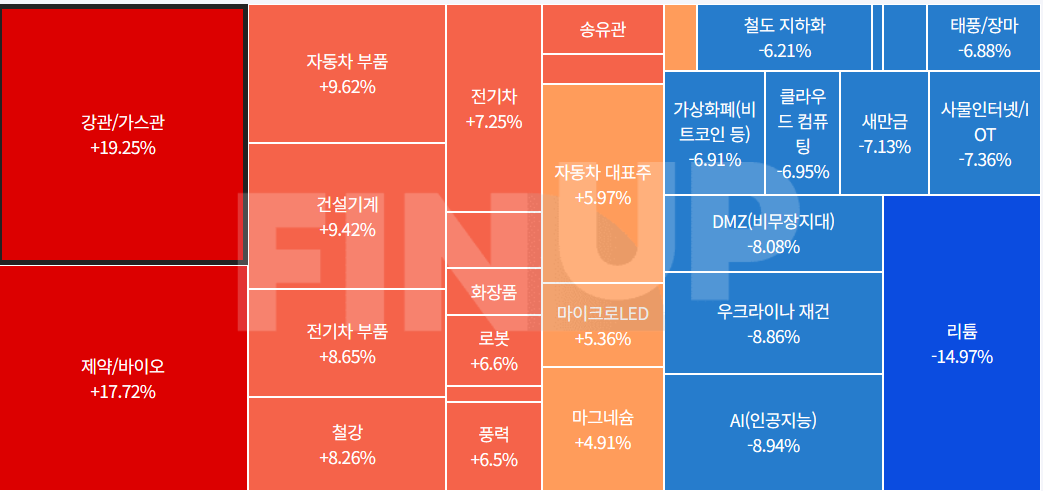 자동차, 강관, 식품, 리튬 관련주가 상승을 보였고, 인터넷, 조선, 결제 관련주는 하락마감.