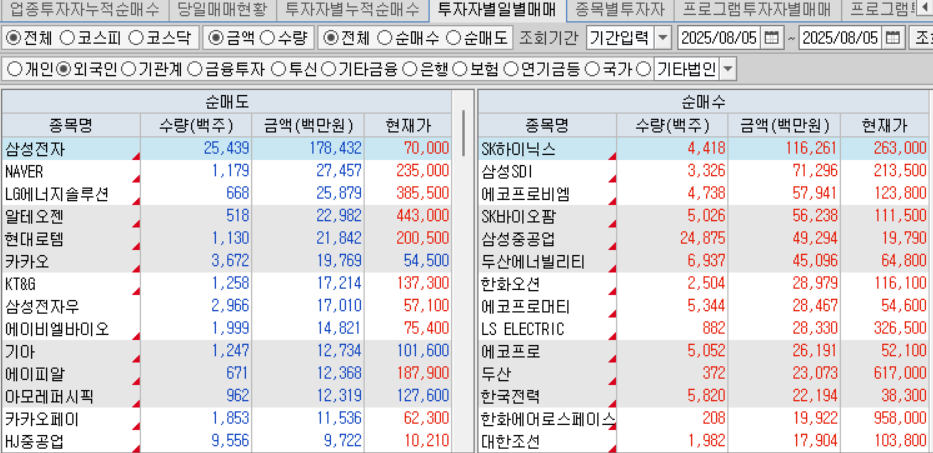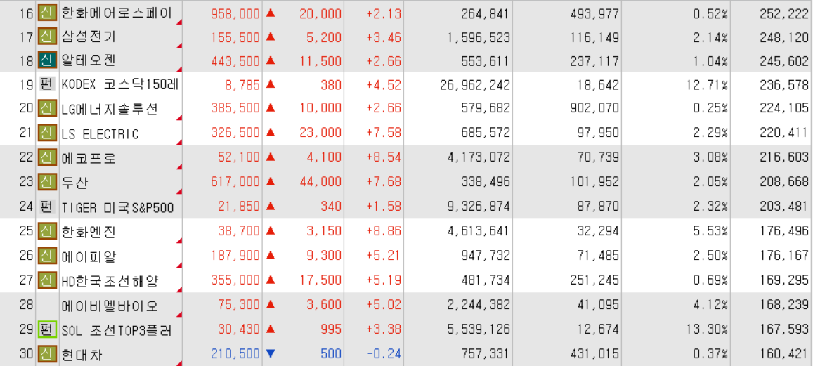 오늘 외국인 순매수 종목은 반도체, 2차 전지, 제약바이오, 조선, 원전, 전력, 방산등을 순매수