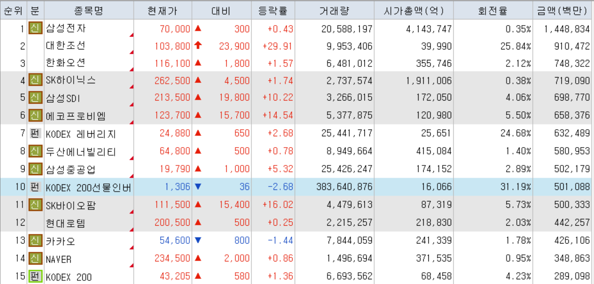 외국인과 기관이 각각 2919억,947억 순매수. 거래대금은 10조 8680억으로 다시 10조 원 회복함.
