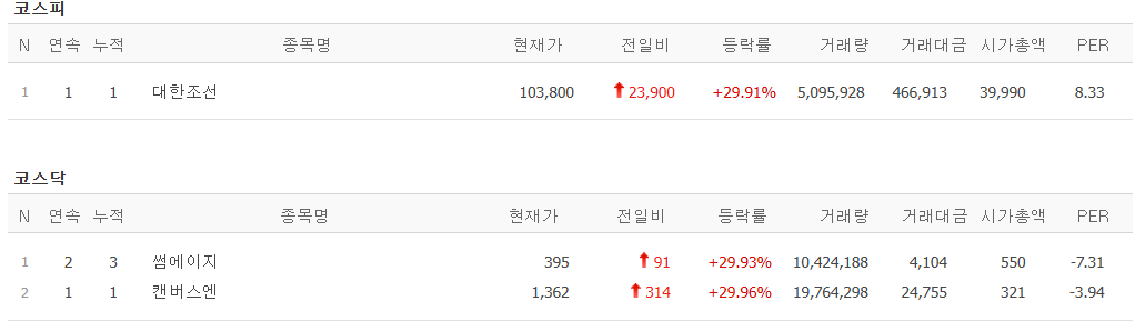 썸에이지는 2 연속 상한가 코인사업진출 이슈지만 적은 거래대금으로 상한가. 캔버스엔 종목은 시총이 작은 종목으로 매각이슈
