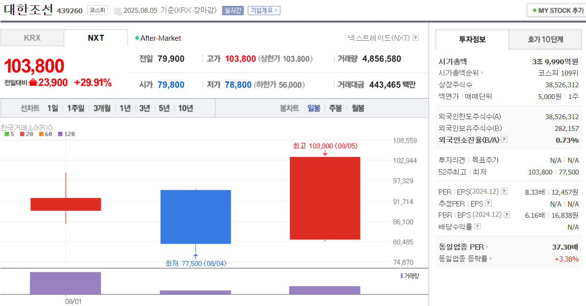 오늘 수급과 조선섹터 이슈와 함께 상한가 마감하며 52주 신고가 경신함.