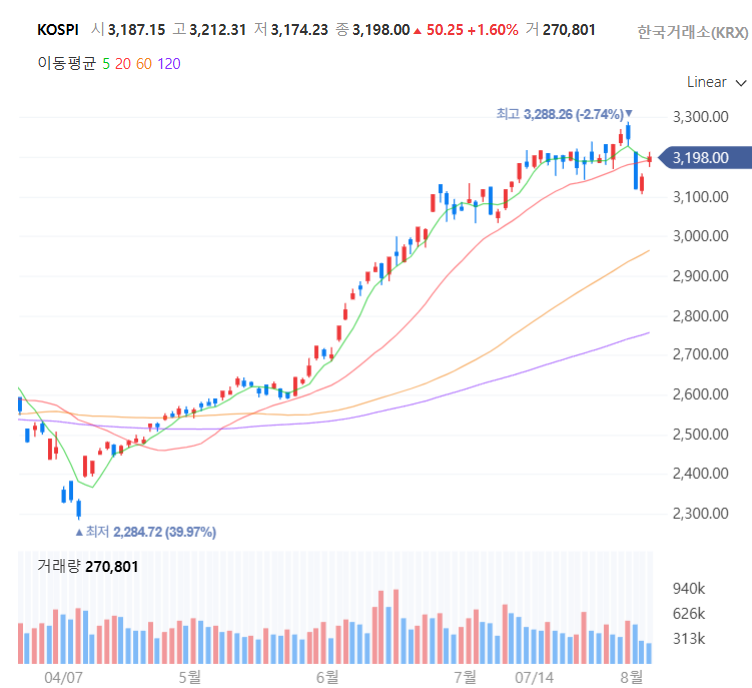 오늘 코스피 지수는 미 금리인하 기대감에 양매수가 들어오면서 상승마감. 코스피 지수는 1.6% 상승한 3198로 마감.