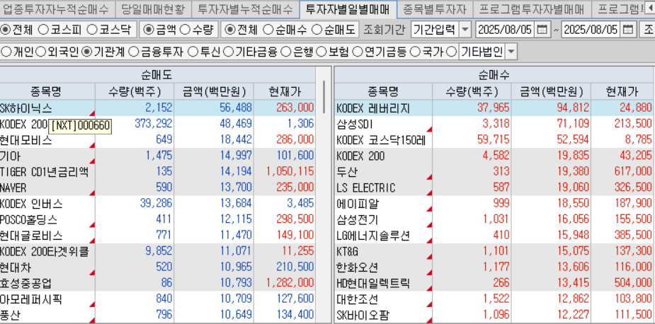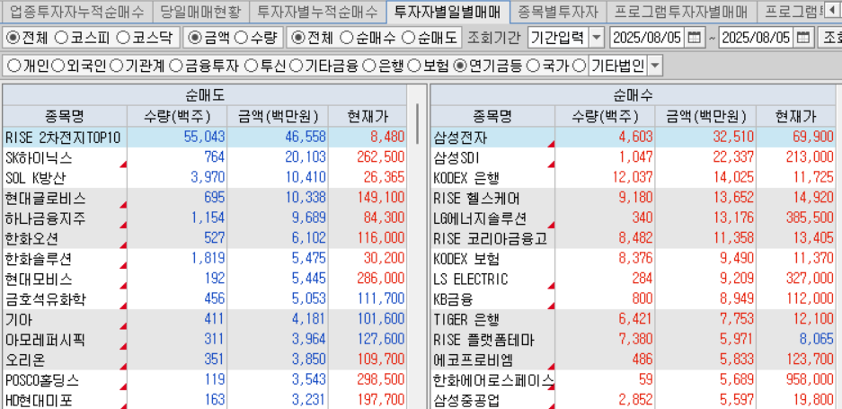 연기금 순매수는 삼전, 2차 전지, 전력, 금융, 방산, 조선을 순매수.