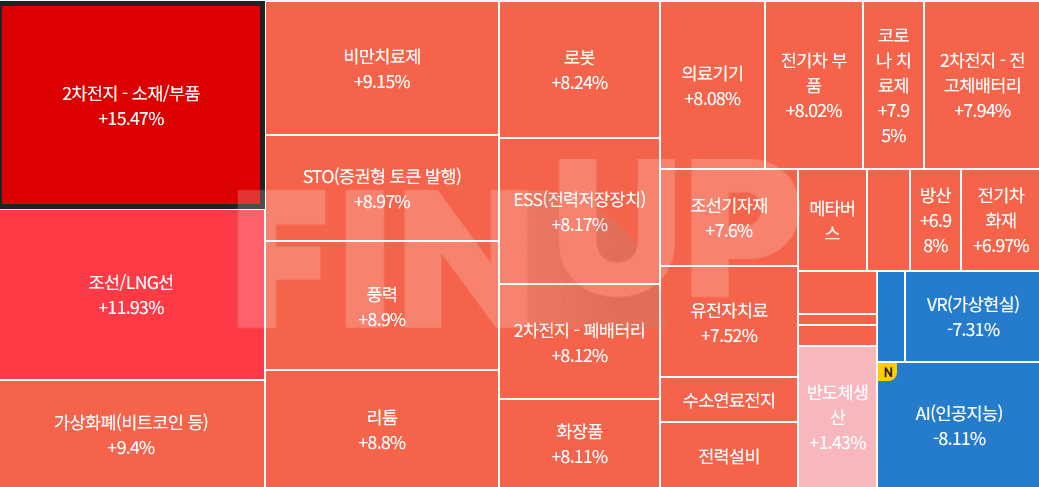 오늘 주도 섹터는 장초반부터 2차 전지가 크게 상승을 보였고, 조선 섹터에서 마스가 이슈로 다시 크게 상승을 보임.