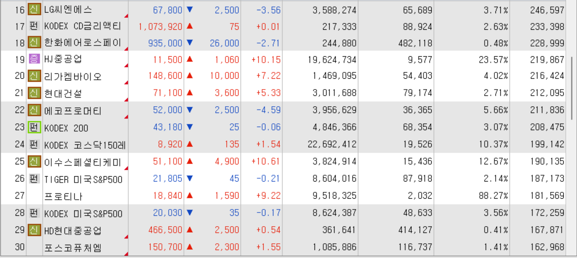 거래대금은 10조 7203억 원으로 전날보다 소폭 줄어듦.