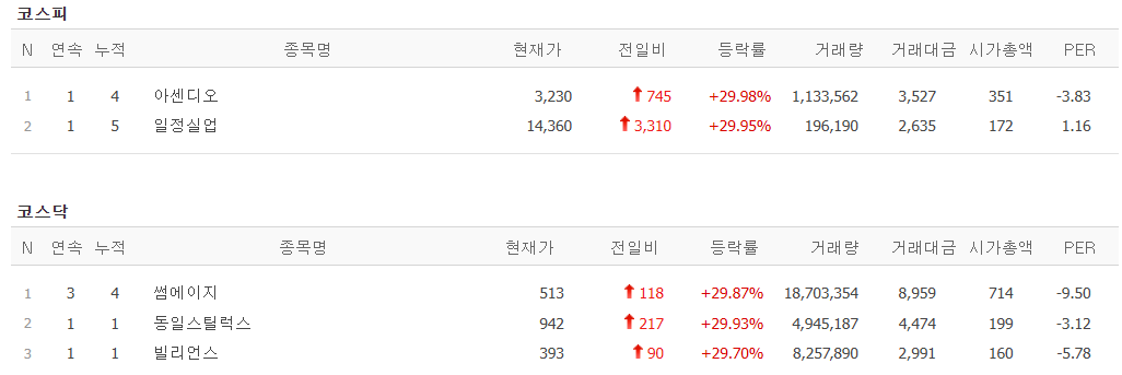 아센디오는 음원회사 특별이슈 없고 일정실업 역시 자동차부품 회사인데 특별이슈 없이 상한가 마감.