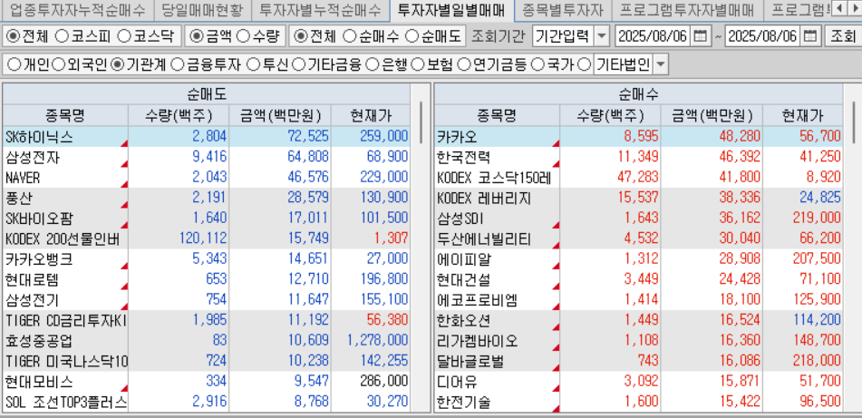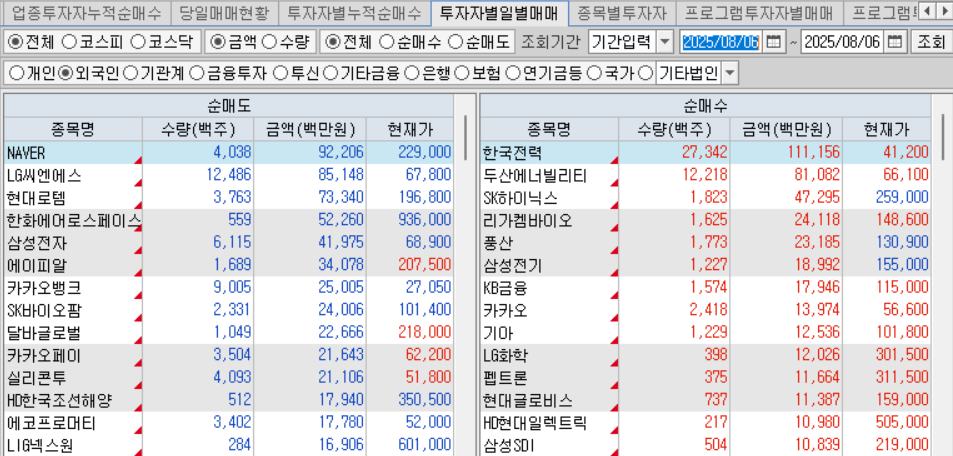 오늘 외국인 순매수는 전력,원전, 반도체, 금융, 방산, 제약바이오, 자동차 등을 순매수.