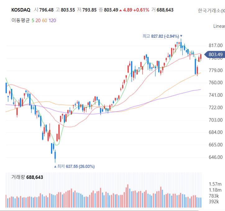 코스닥 지수는 0.61% 상승한 803.49로 마감 . 외국인이 27억 순매도, 기관이 792억 순매수.