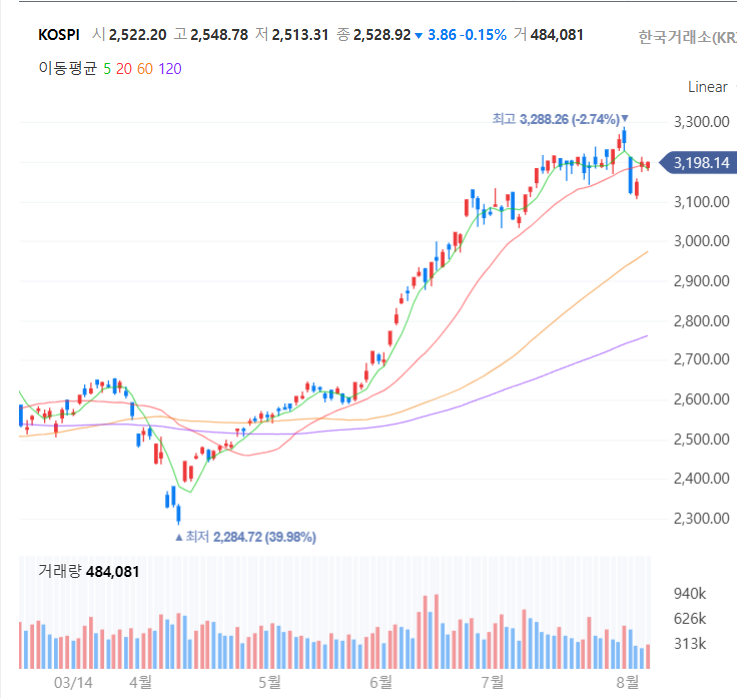 오늘 코스피 지수는 미 반도체, 의약품 관세 이슈로 하락출발했지만  장 막판에 강보합 마감.