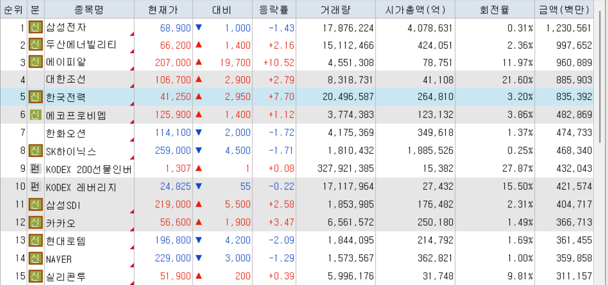 오늘의 거래대금 상위 종목에서는 화장품 섹터가 실적이슈로 크게 상승을 했고, 전력, 원전, 조선기자재,