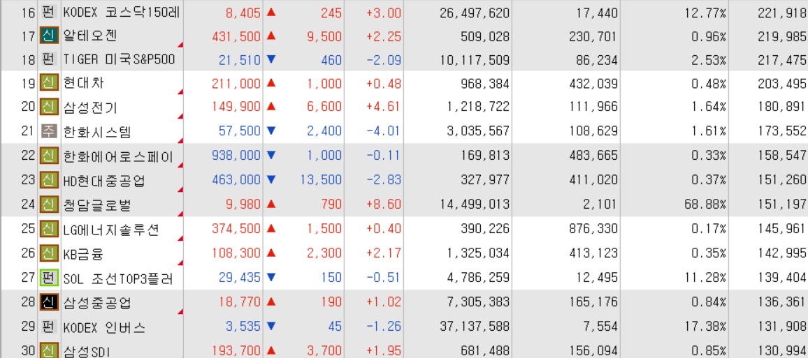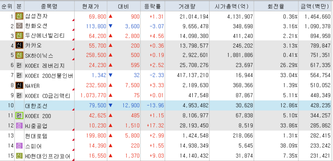오늘 거래대금 상위 종목에서는 금요일 상장했던 대한조선이 차익 실현에 따라 크게 하락 마감을 했고,