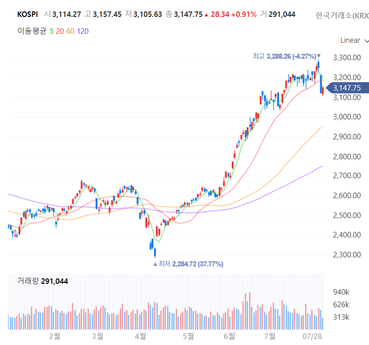 코스피 지수는 0.91% 상승한 3147.75로 마감. 외국인과 기관이 각각 830억 , 1316억 순매수.