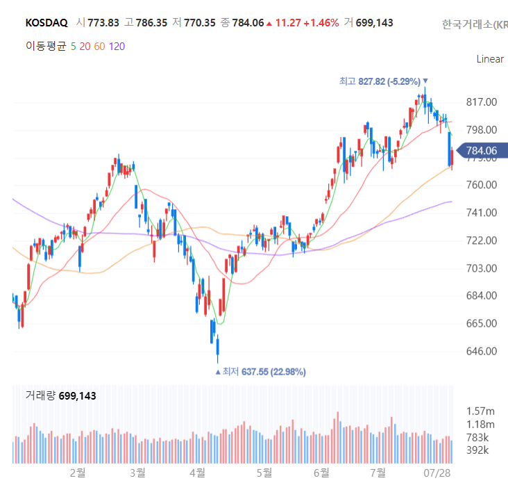 코스닥 지수는 1.46% 상승한 784.06으로 마감. 외국인이 394억 순매도, 기관이 727억 순매수.