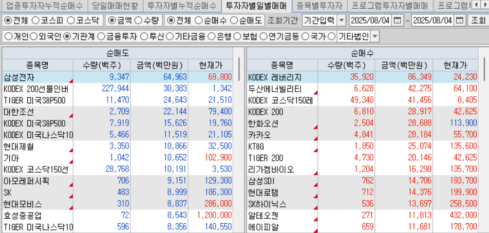 기관 순매수는 원전, 조선,2차전지,반도체,제약바이오,방산,화장품 등.