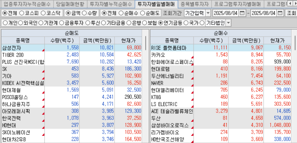 연기금 순매수는 인터넷, 방산, 원전, 전력, 제약바이오, 조선 등을 순매수.
