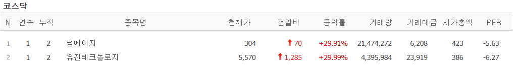썸에이지는 코인 신사업이슈로 상한가 마감했고 유진테크놀로지는 2차 전지 관련주로 특별한 이슈는 없음.