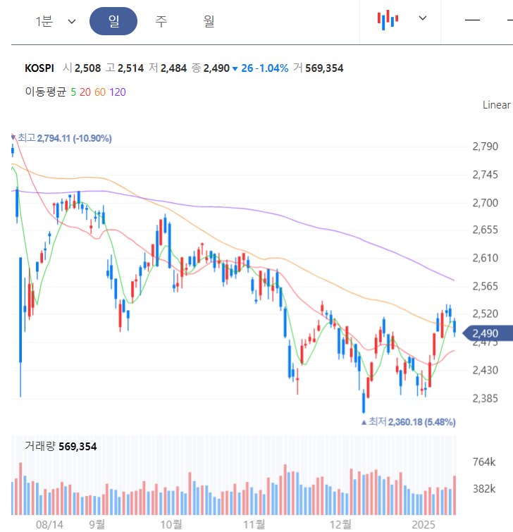 코스피 지수는 2489.56으로 26.22(1.04%) 하락 마감.
