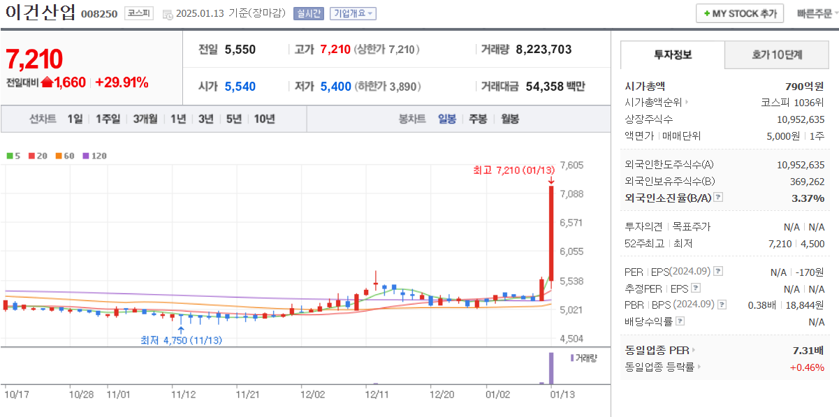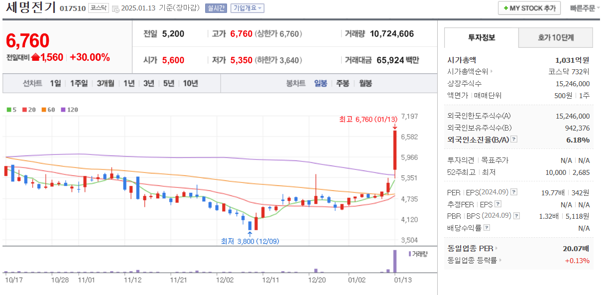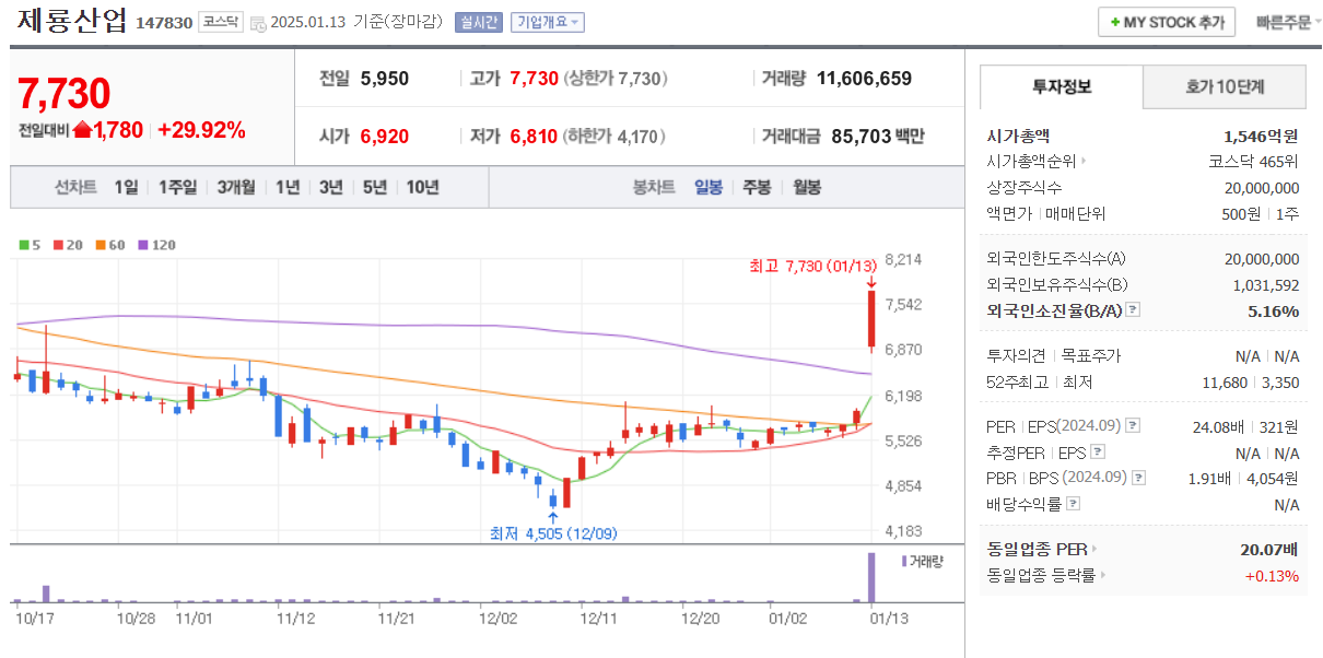 철도자재를 제조 판매하는 기업임. 오늘 상한가 이유로는 미국 LA 산불이슈로 인해 전력공급망 복구 수요
