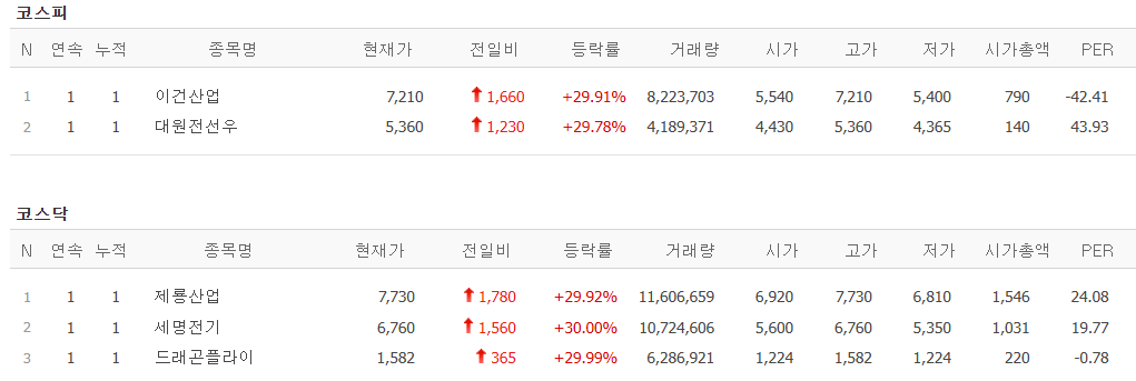 오늘의 상한가 종목