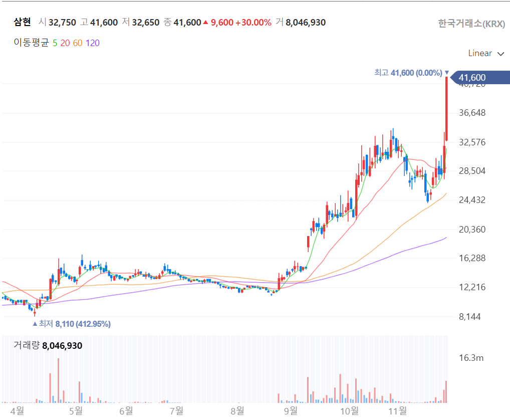오늘 삼현은 무려 상한가(30% 상승)를 기록하며 투자자들의 뜨거운 시선을 한 몸에 받았는데요.