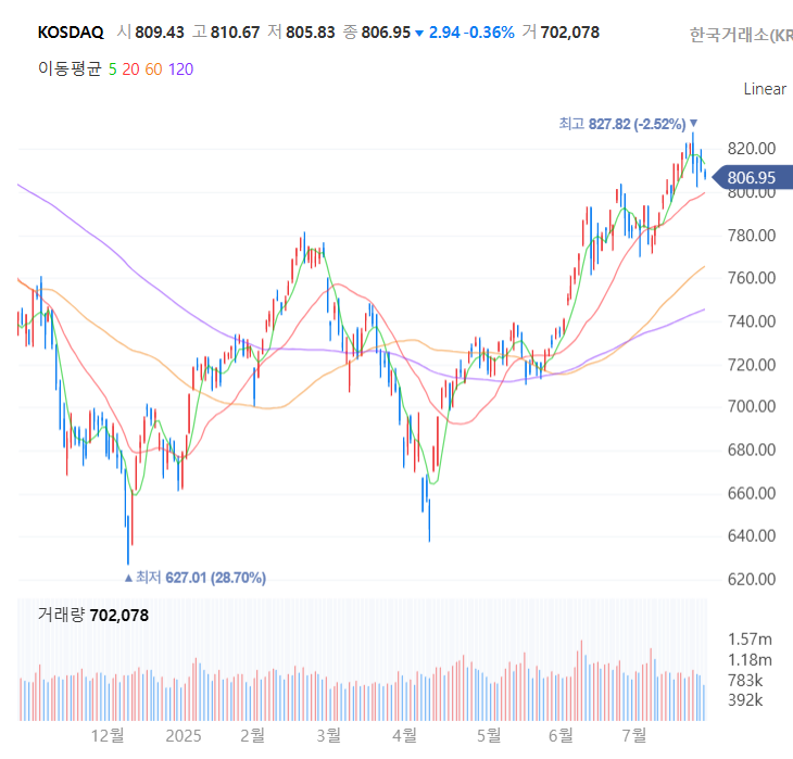 코스닥 지수는 기관 매도세에 하락마감. 코스닥 지수는 0.36% 하락한 806.95로 마감.